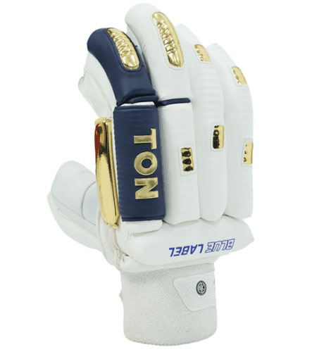 SS Ton Blue Label cricket batting gloves featuring a 3D embossed design, full finger and thumb protection with fiber cotton padding, supplied as a single pair by Sareen Sports Industries, Meerut, India.